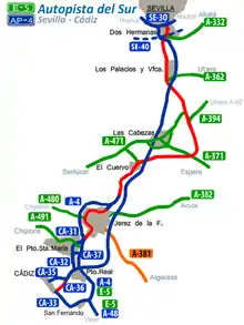 | E-5 AP-4 | Las Cabezas de San Juan - Jerez de la Frontera Norte Tramo original Tramo ampliado | 33,6 33,6 | 2 carriles por sentido: 1972[17][18] 3 carriles por sentido: Pdte. licitación proyecto[19] |