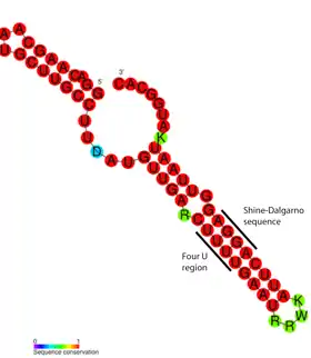 Los termómetros de ARN se encuentran en la 5'-UTR del ARN mensajero, corriente arriba del gen codificante para la proteína.[1] Allí son capaces de ocluir el sitio de unión al ribosoma (RBS) e impedir traducción del ARNm a proteína.[13] Cuando la temperatura aumenta, la estructura en horquilla pierde su integridad y expone el RBS o secuencia de Shine-Dalgarno, para permitir la unión de la subunidad ribosomal pequeña (30S), que a continuación recluta al resto de la maquinaria de traducción.[1] El codón de inicio, encontrado normalmente 8 nucleótidos corriente abajo de la secuencia Shine-Dalgarno,[13] señala el principio de la región codificante del gen que es traducido a proteína por el ribosoma. Además de este mecanismo regulador en cis, un caso de ARN termómetro regulador en trans ha sido encontrado en el ARNm de la proteína RpoS, donde se cree implicado en la respuesta a la inanición.[1]