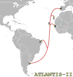 A lo largo de sus aproximados 12 000 km, une las localidades de Las Toninas, en Argentina, Fortaleza en Brasil, Dakar en Senegal, Praia en Cabo Verde, El Médano en Tenerife, Islas Canarias y Lisboa en Portugal.