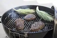 Cocinar a la plancha es cocer carnes u otros alimentos utilizando una parrilla suspendida sobre una fuente de calor. El asado a la parrilla suele realizarse al aire libre utilizando carbón vegetal (madera real o briquetas preformadas), leña o gas propano. Los alimentos se cocinan mediante calor radiante directo. Algunas parrillas de exterior incluyen una tapa para poder utilizarlas como ahumadores o para asar a la parrilla/barbacoa.[17] La rejilla metálica suspendida suele denominarse parrilla.