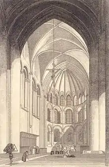 Tiene tres pisos de ventanas, este diseño es único en el mundo en el arte románico. El ábside fue reforzado en el siglo XIV por amplios contrafuertes tras el colapso de su bóveda. A cada lado de la cubierta del ábside hay un piñón y campanarios del siglo XIV. La línea de cresta que curiosamente sale de un vano obstruido en el piñón superior del coro probablemente indica que habría habido acondicionamientos. Las partes superiores conservan sus huecos originales y una serie de gárgolas y modillones románicos.[13]