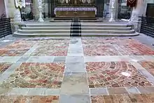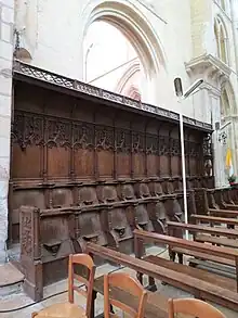 Hoy restaurado y repuesto de acuerdo con un diseño antiguo, el pavimento del siglo XIII del coro de la iglesia abacial, considerado por Arcisse de Caumont como una de las partes más interesantes de la abadía, es un rosetón cortado en cuatro por bandas de piedra caliza compuestas por cuadrados de formas adaptadas a sus posiciones y que representan motivos de ciervos, águilas bicéfalas, quimeras, leones y flores de lis.[10]