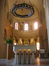- Entre 1008 y 1028, elección del abad Bernier. Emprendió la reconstrucción, comenzando por la cabecera, las cinco capillas radiales y el transepto, con un ábside semicircular orientado en cada brazo .