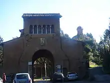 El portal se llama Arco de Carlomagno porque los frescos de su interior recordaban la supuesta donación de las posesiones de Maremma de la que nacía la riqueza de la institución: según la leyenda, el Papa León III hizo llevar la reliquia de San Anastasio en ayuda de Carlomagno empeñado en quitar Ansedonia a los lombardos; sus muros se cayeron por un terremoto, Carlomagno venció la guerra y el monasterio fue dotado con amplias posesiones en Maremma.
