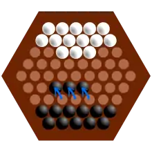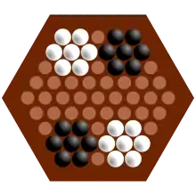 El tablero está formado por 61 huecos circulares distribuidos hexagonalmente. Cada jugador tiene 14 canicas que se encajan en los huecos y que comienzan el juego distribuidas como se muestra en la imagen de la izquierda. El juego se desarrolla por turnos alternativos entre los jugadores, comenzando el juego las negras. Cada jugador puede realizar un movimiento por turno, que puede ser un "movimiento en línea" o un "movimiento en perpendicular" (ver imagen de la derecha), y que puede mover hasta un máximo de 3 canicas.[1]