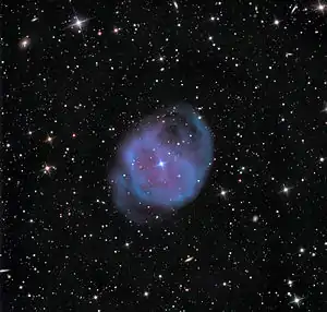 A esta distancia abarca unos 1,5 años luz en esta nítida vista telescópica .Sin dar importancia a las capas exteriores, la estrella central de la nebulosa se contrae, se calienta más y evoluciona hacia una fase final de enana blanca. Se estima que esta estrella central tiene una temperatura superficial de unos 73.000 K, en comparación con los 6,000 K del sol. Como resultado, la estrella extremadamente caliente es mucho más brillante en luz ultravioleta que lo que aquí se ve. La invisible luz ultravioleta ioniza los átomos de hidrógeno y de oxígeno de la nebulosa y, en última instancia, potencia el bella resplandor que presenta en luz visible.[2]