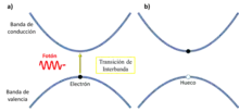 Para que se produzca el proceso de absorción en un semiconductor debe ocurrir que la energía del fotón (ℏω, siendo ω la frecuencia del fotón) sea comparable al gap de energía Eg del material. En ese caso, la absorción provoca la cesión de un electrón desde la banda de valencia hacia la banda de conducción. La ausencia del electrón en la banda de valencia provoca la creación de un hueco en la misma, el cual puede ser tratado de manera efectiva como una nueva partícula que se asemeja a un electrón con carga positiva denotado por h+. A todo este proceso se le llama transición de interbanda y es de gran importancia, ya que, entre otras cosas, da lugar a electrones que contribuyen a la conductividad σ del material. En concreto, esperamos que la σ(ω) (la parte real) de un material generada por una de estas transiciones exhiba un umbral de energía igual a .[2]