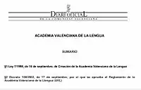 - El contenido de este artículo incorpora material de «Ley 7/1998, de 16 de septiembre, de Creación de la Academia Valenciana de la Lengua.», publicado en el Diario Oficial de la Comunidad Valenciana, que se encuentra en el dominio público de conformidad con lo dispuesto en el artículo 13 de la Ley de Propiedad Intelectual española.