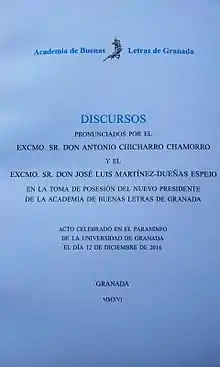 (2016) Discursos pronunciados en el acto de toma de posesión del nuevo presidente de la Academia, por Antonio Chicharro Chamorro y José Luis Martínez-Dueñas Espejo.