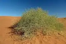 Desde el punto de vista ecológico, la planta se encuentra adaptada para soportar con éxito largos períodos de sequía y sobrevivir en un clima extremadamente árido. La planta no es del tipo suculenta, sin embargo presenta ciertas adaptaciones de tipo xerofítico: las hojas se encuentran reducidas a espinas que ayudan a rechazar a los animales herbívoros, la fotosíntesis se lleva a cabo por el tejido que recubre el tallo, y también los pétalos de las flores masculinas y femeninas son de color verdes. La planta se encuentra asociada con la VA micorriza[2] a fin de maximizar la captación de las sustancias nutritivas que se encuentran en el suelo desértico.[3]