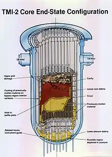- En este caso, la palabra "fusión" se refiere al cambio de estado de sólido a líquido. El núcleo del reactor se derritió parcialmente; no confundir con la fusión nuclear, proceso ajeno a todo lo tratado en este artículo.