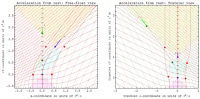 Incluso entonces, si un objeto mantiene una aceleración propia constante desde el reposo durante un período prolongado en el espaciotiempo plano, los observadores en el marco de reposo verán que la aceleración de coordenadas del objeto disminuye a medida que su velocidad de coordenadas se acerca a la velocidad de la luz. Sin embargo, la velocidad propia del objeto se mantiene constante.