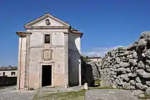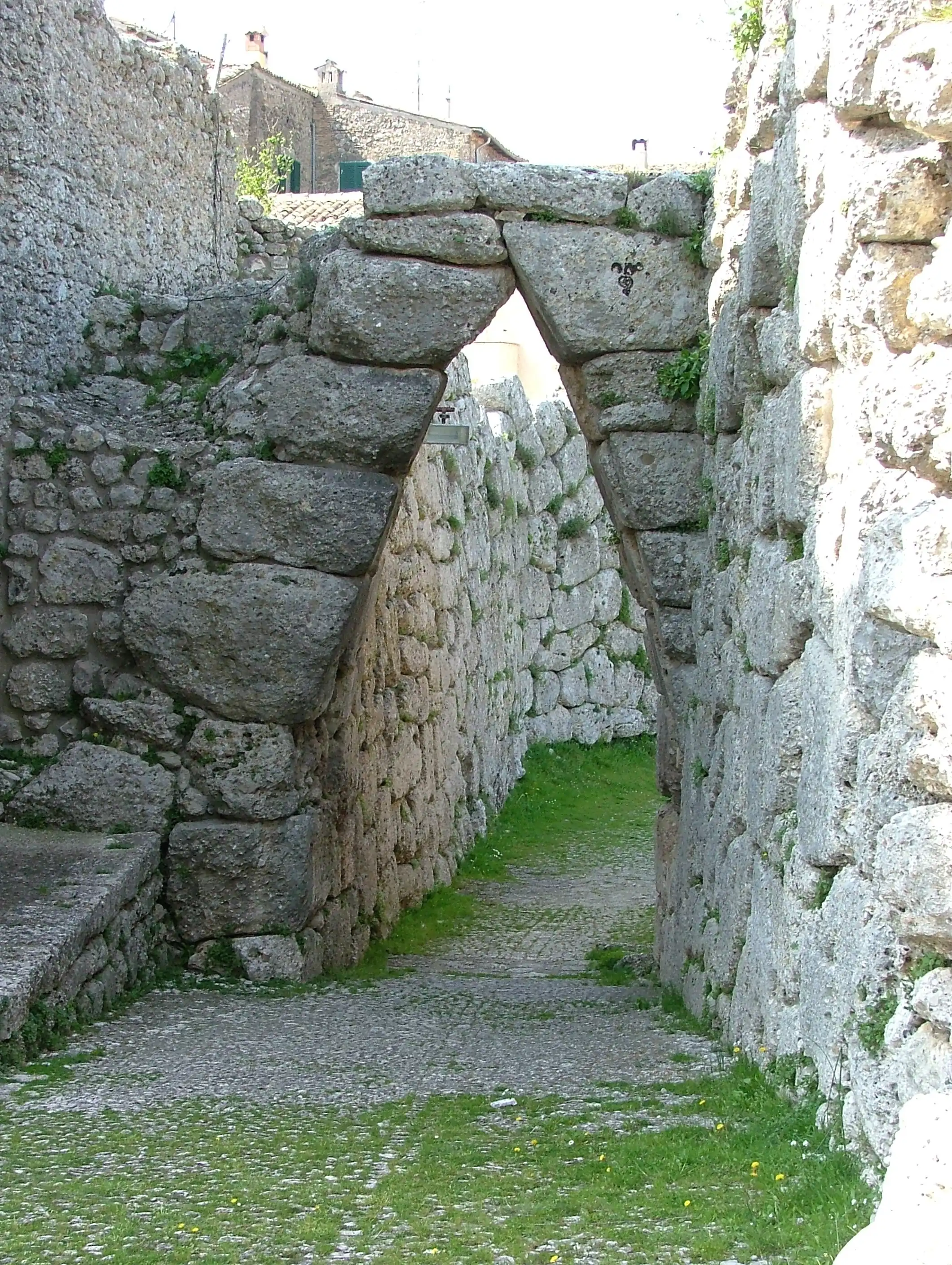 La civitas vetus de la ciudad representa una de las murallas mejor conservadas. Construida en opus polygonale en época prerromana, de particular importancia es la presencia en ella de un "arco de sexto agudo", único superviviente en su género en todo el área mediterránea. Se trata de un típico falso arco, que viene a constituir una puerta denominada scea. Las puertas scee (famosas en la antigua Troya) son aquellas que no se abren frontalmente, sino de lado, y precisamente en el lado siniestro (scaevus, en latín "siniestro") sobre una muralla sghemba; de este modo, para entrar en la ciudad amurallada se debe entrar desprotegido, algo muy importante en una sociedad guerrera.
