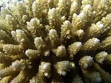 Los pólipos contienen algas simbióticas llamadas zooxantelas. Las algas realizan la fotosíntesis produciendo oxígeno y azúcares, que son aprovechados por los pólipos, y se alimentan de los catabolitos del coral (especialmente fósforo y nitrógeno).[8] Esto les proporciona entre el 75 y el 95 % de sus necesidades alimenticias. El resto lo obtienen atrapando plancton microscópico y materia orgánica disuelta en el agua.