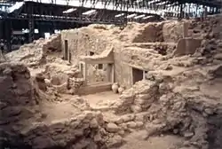 El excelente estado de conservación del lugar se debe al hecho de que estuvo cubierto por una erupción volcánica datada a mediados del II milenio a. C.[2]