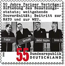 Los Tratados de París y el Estatuto del Sarre fueron aprobados por el Bundestag alemán el 27 de febrero de 1955 contra los votos de los socialdemócratas, y el Bundesrat también los acordó el 18 de marzo de 1955. Tras la ratificación, el Tratado alemán entró en vigor el 5 de enero. Entró en vigor en mayo de 1955 y al día siguiente la República Federal se convirtió en miembro de la UEO y de la OTAN.[7]