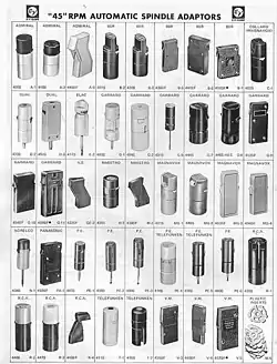 La antigua RCA Corporation introdujo un inserto de plástico a presión conocido como "spider" (araña)[3] para hacer que los discos de 45 rpm fueran compatibles con el tamaño de eje más pequeño de un tocadiscos LP de 33⅓ rpm. Encargadas por el presidente de la RCA, David Sarnoff, e inventadas por Thomas Hutchison, las arañas se hicieron muy populares en la década de 1960, y se vendieron decenas de millones por año. El adaptador de Hutchison incluía pequeñas protuberancias denominadas "pivotes de transmisión", que evitaban que los discos apilados patinaran unos contra otros al ser reproducidos secuencialmente. Varios fabricantes produjeron adaptadores tipo "araña" con formas ligeramente distintas y muchos colores diferentes, aunque el amarillo y el rojo fueron los más utilizados.