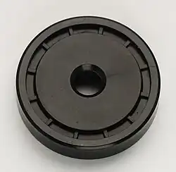 A partir de entonces, los nuevos tocadiscos pasaron a incluir una pieza de plástico con forma de disco perforado en su centro (su forma recuerda a la pastilla que se utiliza en el hockey sobre hielo, por lo que en inglés se denomina coloquialmente como puck), que insertada en el eje metálico central, permitía situar correctamente los discos de 45 rpm para ser reproducidos. Los insertos fijos del tipo spider tenían la misma función, pero con la ventaja de que podían apilarse varios discos para su reproducción secuencial automática en los mecanismos que con este fin solían incluir muchos tocadiscos para reproducir LPs en serie.