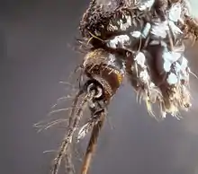 Por sus marcas blanquecinas, se le conoce en algunos países (Venezuela, por ejemplo) con el nombre de zancudo patas blancas.