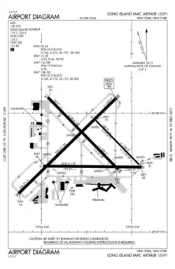 - Información del Aeropuerto MacArthur de Long Island en AirNav (en inglés)