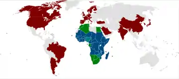 Argelia, Angola, Benín, Botsuana , Burkina Faso, Burundi, Camerún, Cabo Verde, Chad, Comoras, Congo, Costa de Marfil, Egipto, Eritrea, Etiopía, Gabón, Gambia, Ghana, Guinea, Guinea Ecuatorial, Guinea-Bisáu, Kenia, Lesoto, Liberia, Libia, Madagascar, Malaui, Malí, Marruecos, Mauricio, Mauritania, Mozambique, Namibia, Níger, Nigeria, Uganda, República Centroafricana, República Democrática del Congo, Ruanda, Santo Tomé y Príncipe, Senegal, Seychelles, Sierra Leona, Somalia, Sudáfrica, Sudán, Suazilandia, Tanzania, Togo, Túnez, Yibuti, Zambia, Zimbabue,