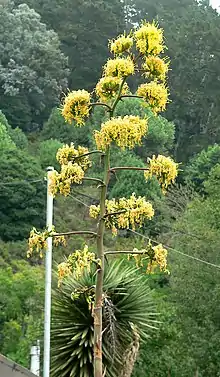 La inflorescencia es un tubo floral de hasta 4 m de altura, con flores de unos 12 cm de largo y color amarillo.