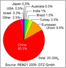 Los sistemas de calentamiento de agua solar son populares en China, donde los modelos básicos comienzan alrededor de 1,500 yuanes (US$235), aproximadamente un 80% menos que en los países occidentales para un tamaño de colector dado. Al menos 30 millones de hogares chinos tienen uno. La popularidad se debe a los tubos evacuados eficientes que permiten que los calentadores funcionen incluso bajo cielos grises y a temperaturas muy por debajo del punto de congelación.[17][18]