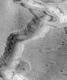 Elementos similares a los glaciares en Marte se conocen de diversas maneras como fenómenos de flujo viscoso,[126] rasgos de flujo marcianos, lóbulos de derrubios frontales o rellenos de valles lineales, dependiendo de su forma característica y de su ubicación. Muchos de los pequeños glaciares, pero no todos, parecen estar asociados con barrancos en las paredes de los cráteres y en el material del manto. Los depósitos lineales conocidos como rellenos de valles lineales son probablemente glaciares cubiertos de roca que se encuentran en los lechos de los canales del terreno alterado que aparecen alrededor de Arabia Terra en el hemisferio norte. Sus superficies tienen materiales estriados y ranurados que se desvían alrededor de obstáculos. Los depósitos de lineales en los lechos pueden estar relacionados con detritos frontales lobulados, que se ha comprobado que contienen grandes cantidades de hielo mediante observaciones de radar en órbita. Durante muchos años, los investigadores interpretaron que estos detritos frontales lóbulados eran flujos glaciares y se pensó que el hielo podía existir bajo una capa aislante de rocas.[127][128][129] Con las nuevas lecturas del instrumento, se ha confirmado que los lóbulos de desechos frontales contienen hielo casi puro cubierto por una capa de rocas.[120][121]