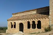 El templo data de mediados del siglo XII y cuenta con una sola nave cubierta con armadura de madera que acaba en ábside semicircular. La galería aneja se sustenta en columnas con basa sobre altos podios y está construida en sillería, a diferencia del resto del edificio, que se levantó en mampostería. La portada, muy abocinada, tiene cuatro arquivoltas, tres de ellas apoyadas en columnas con capiteles decorados