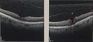 ![]() Tomografía de coherencia óptica de un agujero macular (derecha), comparado con una mácula normal | ||