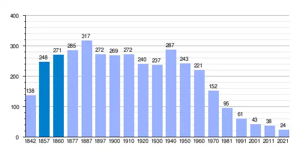 | Gráfica de evolución demográfica de Ahigal de Villarino[18] entre 1842 y 2021 |