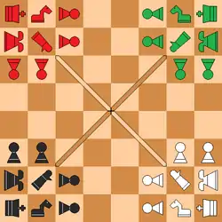 Las piezas van en las cuatro esquinas. En sentido horario, el orden es: piezas rojas, piezas verdes, piezas blancas y piezas negras. En el casillero de cada esquina va el rey de cada jugador. El caballo está adyacente al rey, y con respecto a este apunta a las piezas blancas en el caso de las negras y viceversa, y lo mismo para las rojas y verdes. La torre está adyacente al rey, y con respecto a los propios, las torres roja y negra se apuntan entre sí, y lo mismo para las torres verde y blanca. Los alfiles están en el casillero diagonal próximo al rey de cada jugador, y hay cuatro peones para cada uno rodeando sus esquinas.