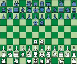 Este ajedrez se juega en un tablero de 12X10 casillas y un conjunto de 34 piezas para cada jugador. En una configuración como la que se ve en la imagen de la derecha: