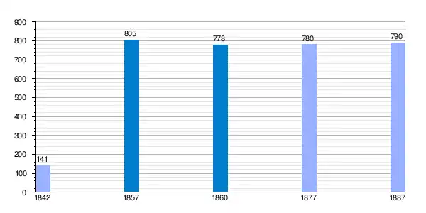 | Gráfica de evolución demográfica de Albella y Planillo[3] entre 1842 y 1887 |