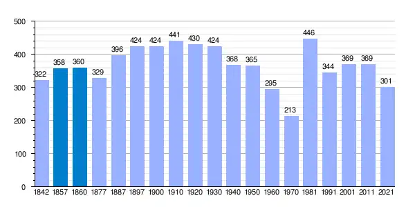 | Gráfica de evolución demográfica de Alcalá del Obispo[12] entre 1842 y 2021 |