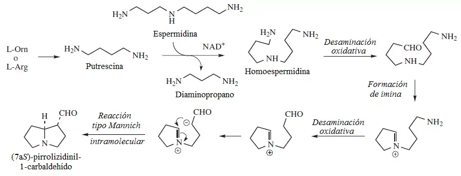 La biosíntesis de las necinas procede a partir de la homoespermidina, un dímero de la putrescina formada por la transferencia de un grupo aminobutil trasferido de la putrescina a la espermina por la acción de la homoespermidina sintasa (EC 2.5.1.45) A partir de esta etapa, se establecen los siguientes pasos: