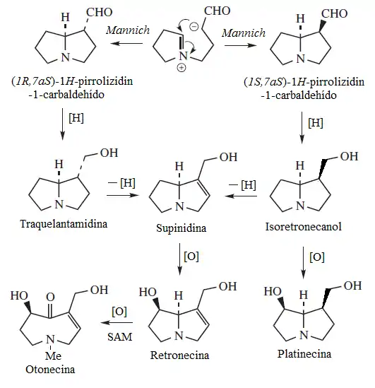 El producto de esta reacción es el (1R, 7aS)-pirrolizidin-1-carbaldehído. Existe la posibilidad de formar el isómero 1S. Este aldehído es el precursor inmediato del resto de las necinas. Las otras necinas se forman por oxidación (oxigenación o deshidrogenación). La otonecina es una hidroazonina formada por la metilación y oxidación de la retronecina.