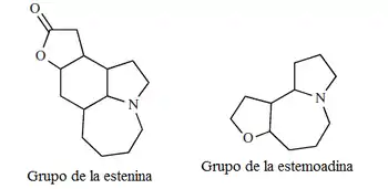 - e) Genalcaloides: —u óxidos aminados de alcaloide— son derivados por oxidación de los alcaloides que contienen el grupo R=(NO)-R, donde el nitrógeno tiene número de oxidación +5, en contraposición a los alcaloides normales, donde es trivalente (R=N-R). Su acción es la misma que la del alcaloide del cual provienen, pero es más pausada. Se nombran añadiendo el prefijo gen- al nombre del alcaloide. Algunos genoalcaloides se encuentran en la naturaleza, como la geneserina (derivado del alcaloide eserina (fisostigmina)) presente en el haba de Calabar.[4]