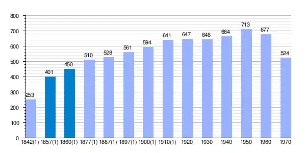 | Gráfica de evolución demográfica de Aldea del Rey Niño[6] entre 1842(1) y 1970 |
