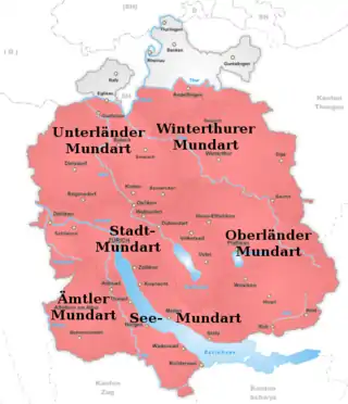 - El dialecto de Zürcher Oberland alrededor del lago Pfäffikon y en el alto valle de Töss;
