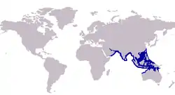 Se encuentra en las regiones tropicales del Índico y del oeste del Pacífico.