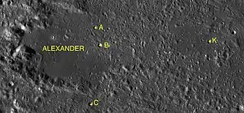 Por convención estos elementos son identificados en los mapas lunares poniendo la letra en el lado del punto medio del cráter que está más cerca de Alexander. Alexander A, B y C están todos en el este, con los dos primeros ubicados uno junto al otro, el tercero en el sureste y Alexander K más al este.