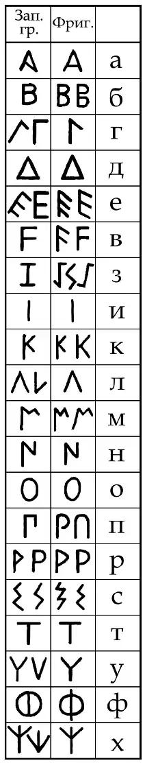 En la primera columna el alfabeto griego; en la segunda, el frigio, y en la tercera el sonido correspondiente en alfabeto búlgaro
