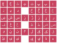 | Letras | ا ب ﭖ ت ټ ث ج ﭺ ځ څ ح خ د ډ ذ ر ړ ز ﮊ ږ س ش ښ ص ض ط ظ ع غ ف ق ک ګ ل م ن ڼ و ه ی ي ې ۍ ٸ | |
