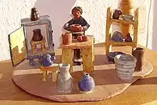 - Modelado a torno: llamado también «torno rápido», es muy común que las piezas hechas en torno sean terminadas manualmente. El torno de alfarero es la técnica más utilizada para la creación de piezas en serie. En la actualidad también es empleado para hacer piezas singulares o artísticas. Este método es empleado desde el año 5000 a. C. en el Antiguo Egipto, Oriente Próximo y Asia. En la península ibérica llegó hacia el siglo VIII a. C., de mano de los fenicios, si bien existen cerámicas a torno más antiguas importadas de otras zonas del Mediterráneo. Para trabajar con él, se coloca una bola o pella de arcilla en la rueda del torno, el cual es impulsado por el pie del alfarero que lo hace girar. La rueda gira velozmente mientras la arcilla es presionada de una manera determinada para que adquiera la forma deseada. El trabajo con torno requiere una gran habilidad técnica, pero un alfarero habilidoso puede producir muchas piezas casi idénticas en poco tiempo. Actualmente se utiliza más el torno eléctrico que requiere menos esfuerzo.[60] Debido a su naturaleza, los trabajos mediante el empleo de torno son casi exclusivamente piezas con simetría radial respecto de un eje vertical. Estas piezas pueden ser decoradas mediante la creación de diferentes texturas sobre su superficie al objeto de hacerlas visualmente más interesantes. Muchas veces, las piezas creadas en el torno son modificadas manualmente, agregándole asas, tapas, pies, picos y otros aspectos funcionales.[61]