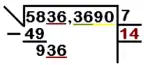 • Paso 3: El número obtenido (7) es el primer resultado de la raíz cuadrada. En el paso anterior lo escribíamos en el cajetín de la derecha. Ahora lo multiplicamos por sí mismo. El resultado (49) se escribe debajo del primer grupo de cifras de la izquierda (58), y se procede a restarlo. El resultado de la resta 58-49 es 9. Una vez obtenido el resultado de la resta, se baja el siguiente grupo de dos cifras (36), con lo que la siguiente cifra de la raíz es ahora la unión del resultado de la resta anterior con las nuevas cifras bajadas (es decir, 936).Para continuar la extracción de la raíz cuadrada multiplicamos por 2 el primer resultado (7) y lo escribimos justo debajo de éste, en el siguiente renglón auxiliar (en la imagen, el 14 está escrito justo debajo del 7, ya que 7 x 2 es 14).