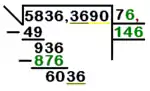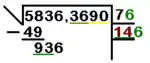 • Paso 5: El procedimiento es el mismo que anteriormente. El resultado de la operación anterior (876) se coloca debajo del número procedente de la resta anterior (936) y se restan. Al resultado de la resta (60) se le añade el siguiente grupo de cifras del radical (en este caso, 36). Si el siguiente grupo está después de la coma decimal se agrega una coma decimal al número de la raíz. El nuevo número obtenido es 6036.