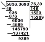 La raíz cuadrada de 5836,369 es 76,39, con un residuo de 0,9369. Recordemos que el cero es sólo un auxiliar. Es también que la operación anterior utilizada como ejemplo no está completa. Si la continuáramos daría como resultado 76,396132101 (con nueve decimales).