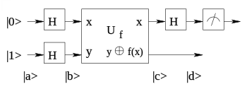 La entrada al circuito es: , que atraviesa dos puestas Hardamard (véase la figura) obteniéndose . Esto atraviesa el bloque Uf obteniéndose