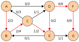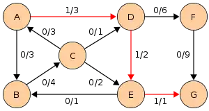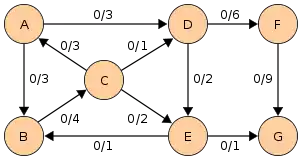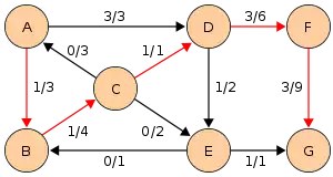 En los pares escritos en los lados , es el flujo actual, y es la capacidad. La capacidad de la resta entre y es , la capacidad total, menos el flujo que está en uso. Si el flujo desde a es negativo, esto contribuye a la capacidad del residuo.